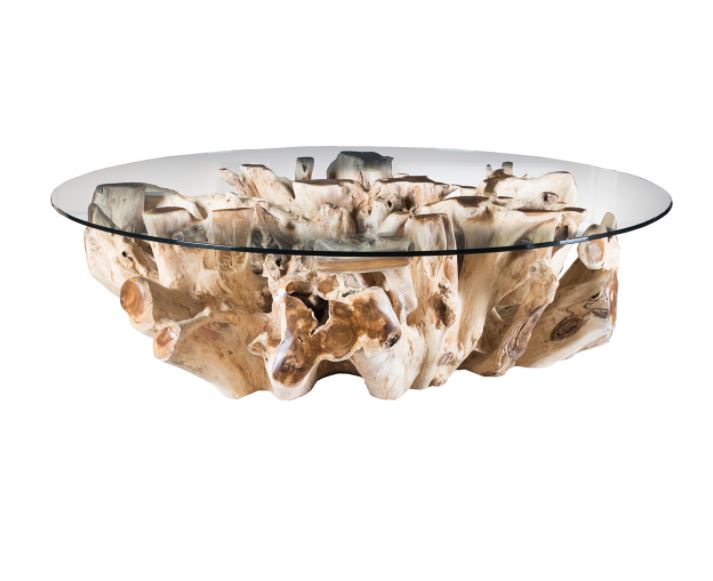 The Willow Coffee Table is made with a tree root that has been trimmed and hand finished to enhance the exquisite forms of the wood. A tempered glass completes the look. With materials taken directly from nature, each table will differ in shape