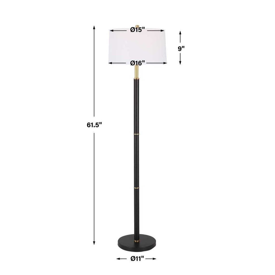 Simple in design, this black metal floor lamp is embellished with gold rings equally spaced along the length of the body. Finished with a slightly tapered hardback shade in a soft white linen fabric with light slubbing.
