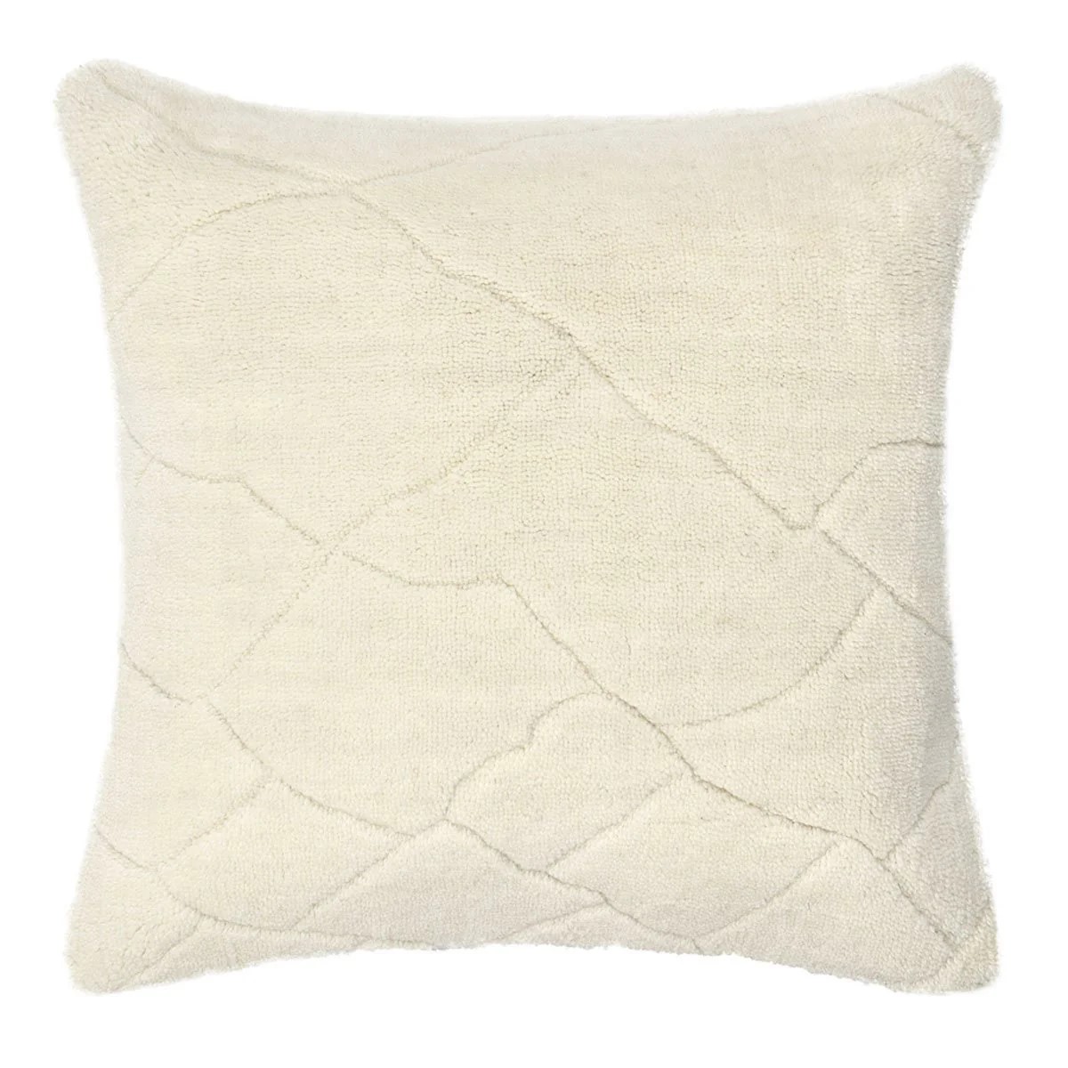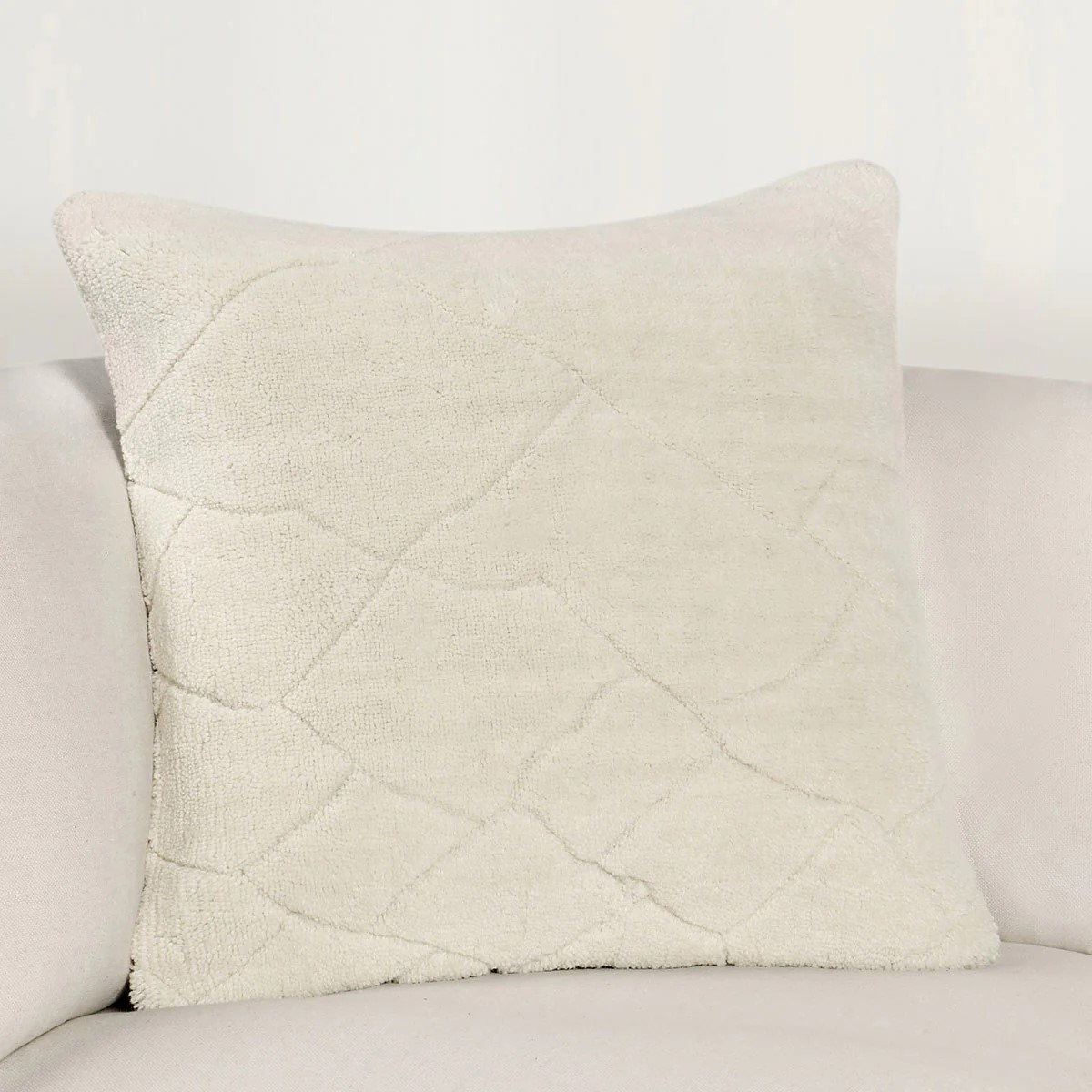 Organic in look and feel, this pillow features New Zealand wool hand-tufted with a touch of soft cotton. The abstract design evokes the imagery and patterns of nature including those found in waves, shells, or sand dunes. Each pillow offers subtle variations in color and texture, making each piece a distinctive accent in any design.