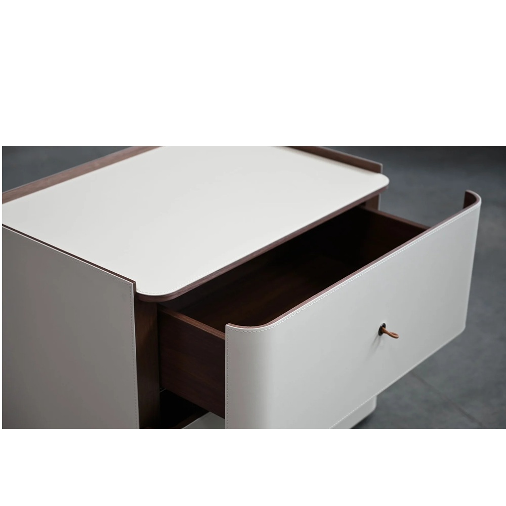 The SUMU nightstand is upholstered in leather. This piece offers a minimal and clutter-free design, featuring three drawers with leather pulls that provide ample bedside storage while maintaining a sleek appearance. Its curved edge shape enhances the sense of space in smaller bedrooms.
